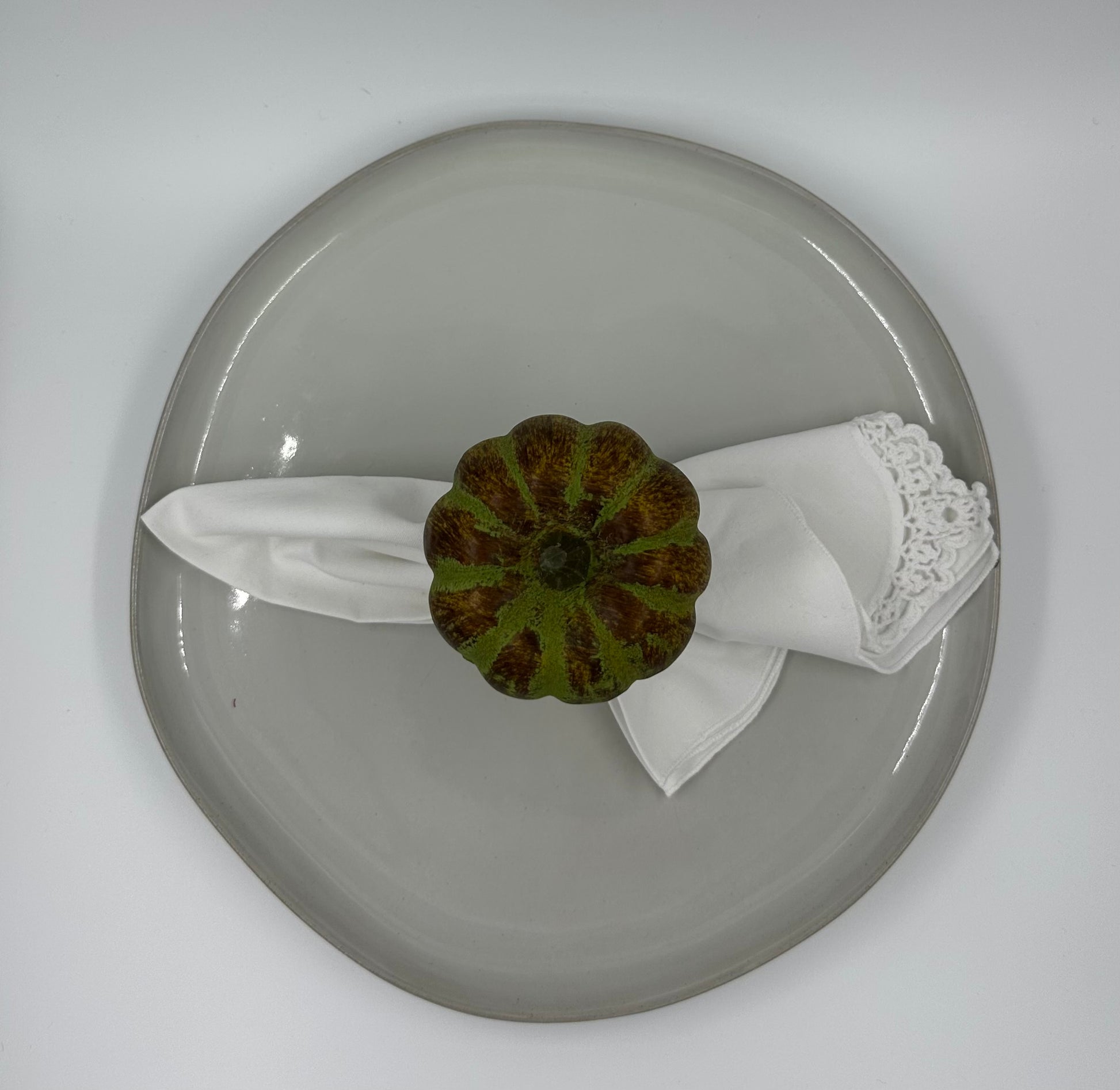 Celebrate the beauty of fall with our handmade set of 4 napkin rings, featuring charming pumpkins in vibrant green with orange and yellow marbling. Each pumpkin measures approximately 4 inches, paired with natural wood rings about 2 inches in diameter. These napkin rings are perfect for an autumn dinner or Thanksgiving celebration, providing a festive and warm touch to your table setting. Crafted with care and attention to detail, they are of an excellent size to impress your guests and create a cozy, inviting atmosphere. Ideal for gathering family and friends, these napkin rings will enhance your special occasion, helping you give thanks for the many good things in life.
