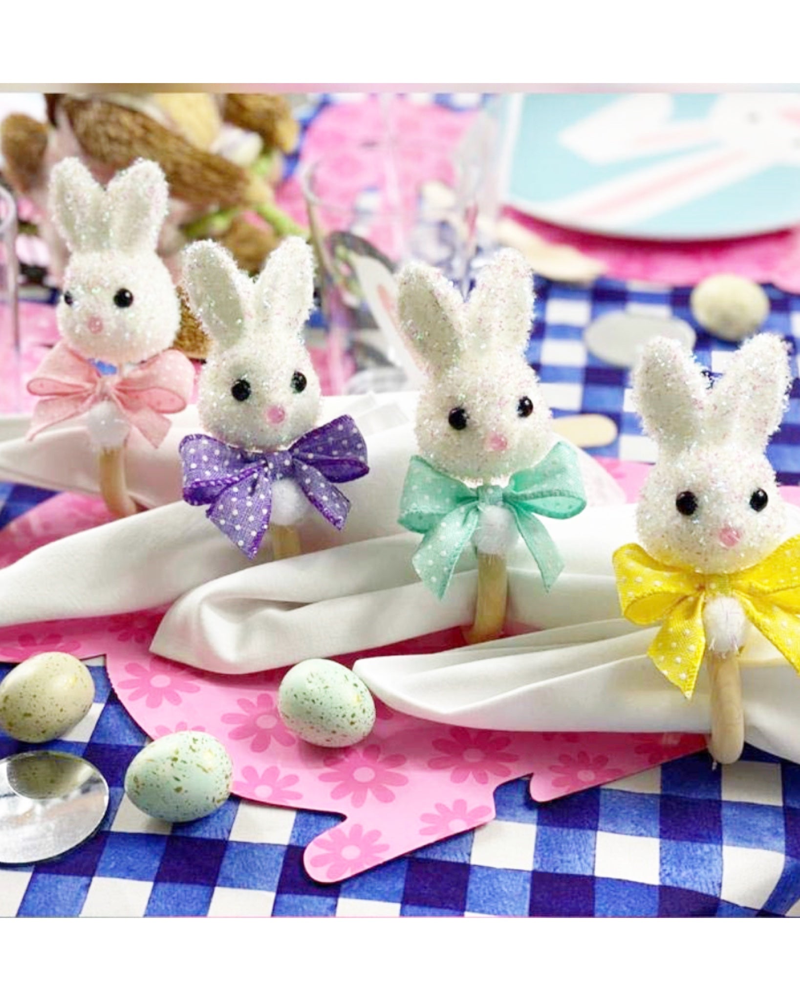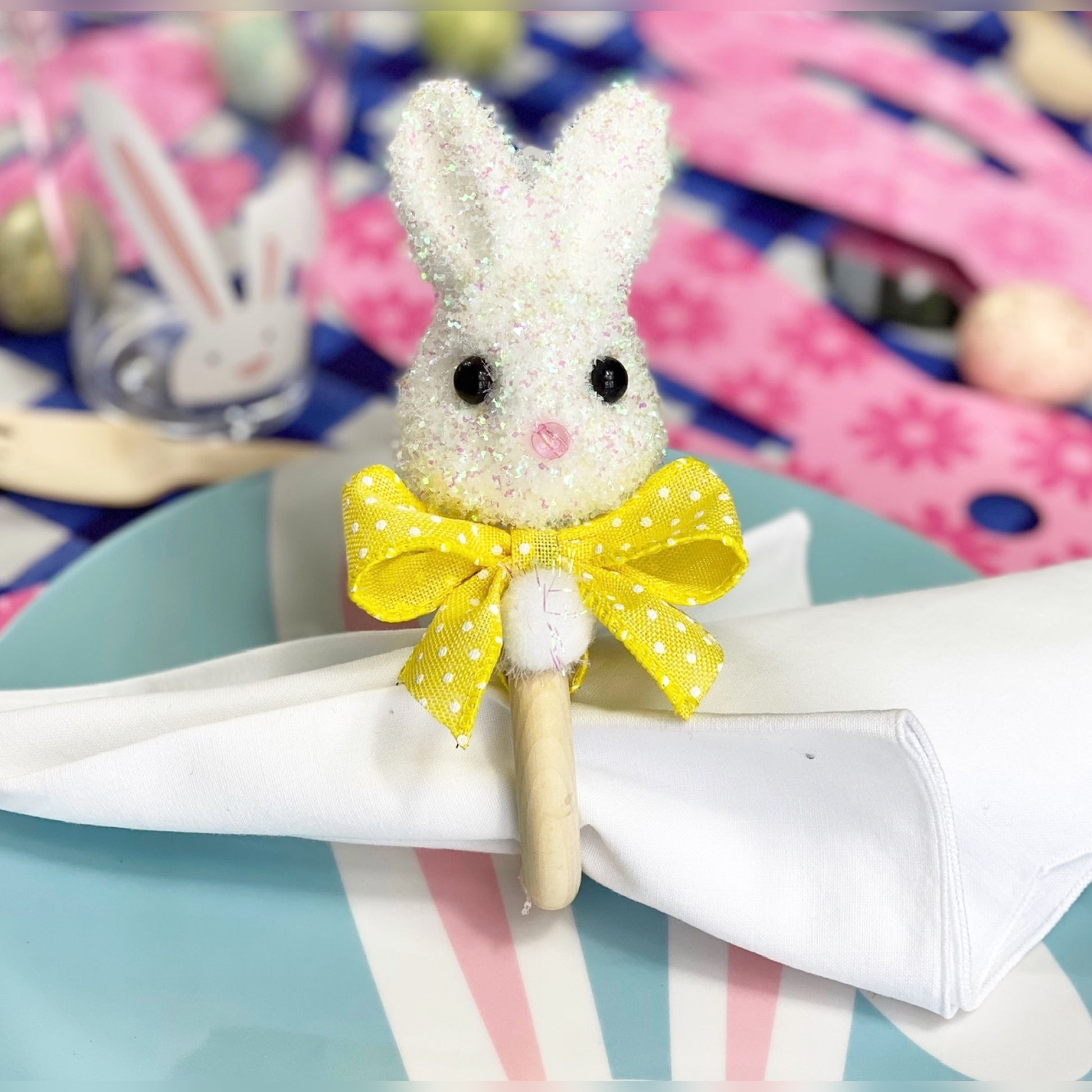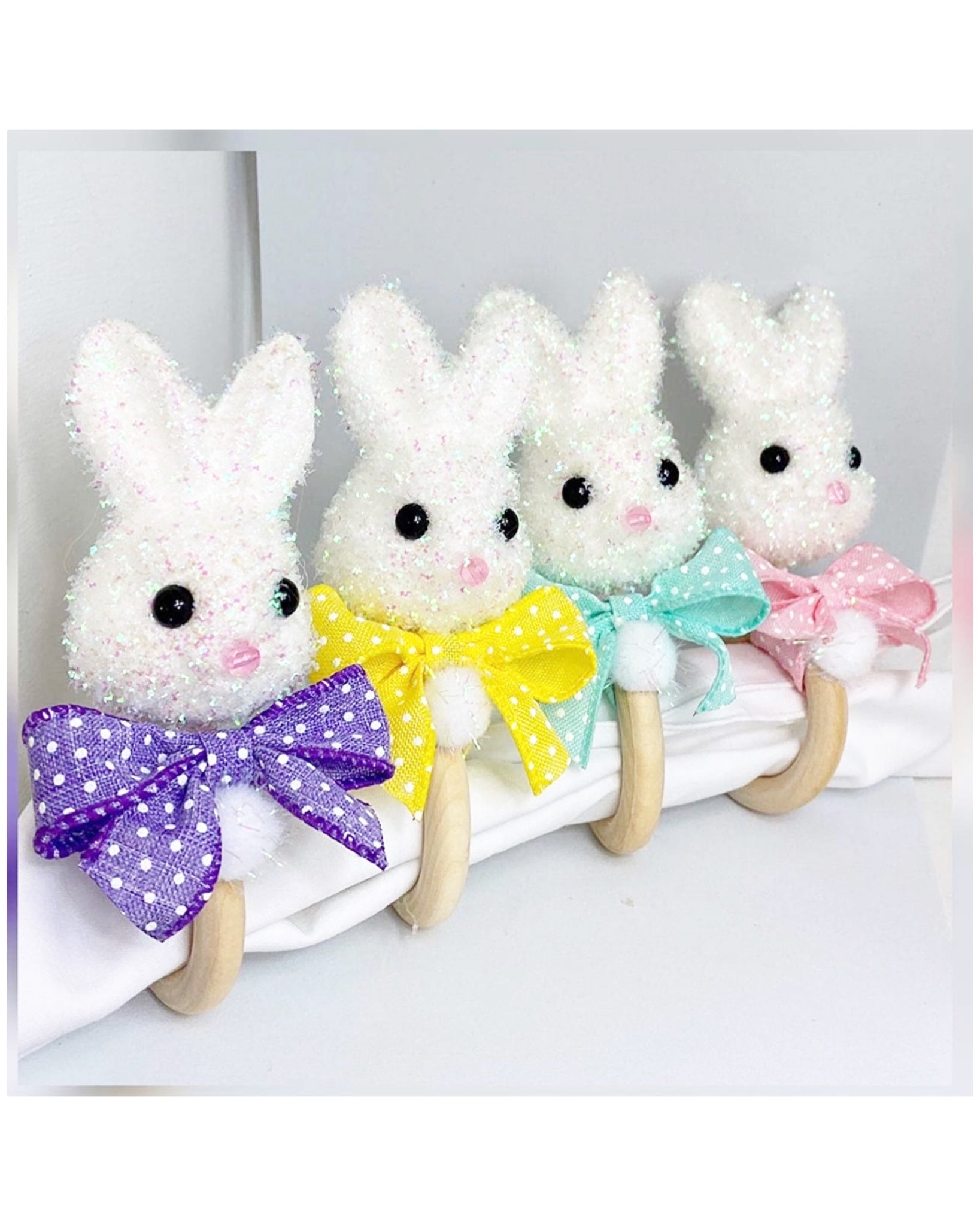 Get ready to hop into spring with these adorable Easter rabbit napkin rings! Each set includes 4 handmade rustic napkin rings made with natural wood rings, topped with a fun white rabbit head featuring glitter and a bow tie in lilac, yellow, light blue, and white dot colors. These napkin rings are perfect for adding a playful touch to your Easter table decor and will hold any napkin style. Plus, they're sure to attract bunny rabbits! π°π₯