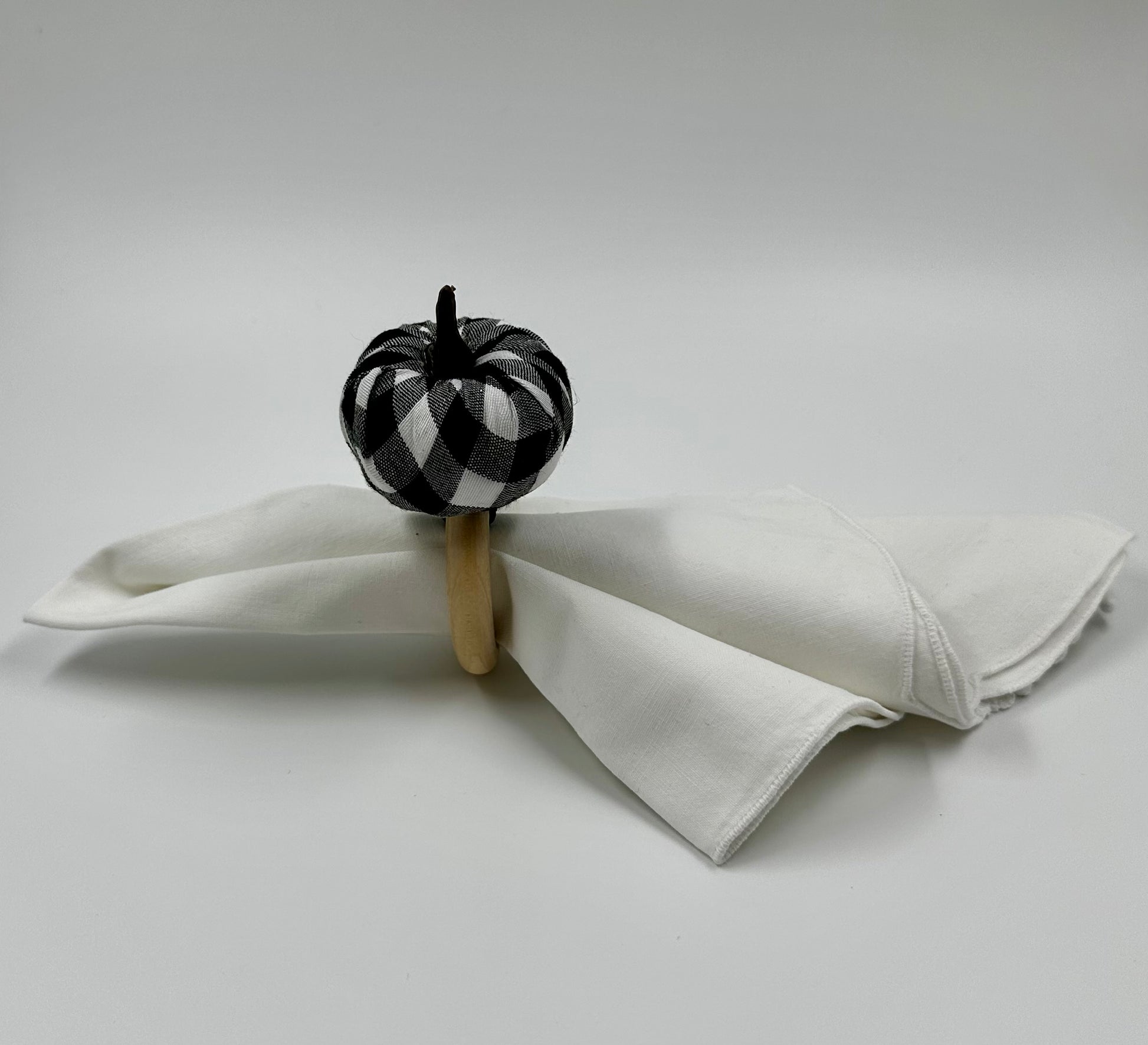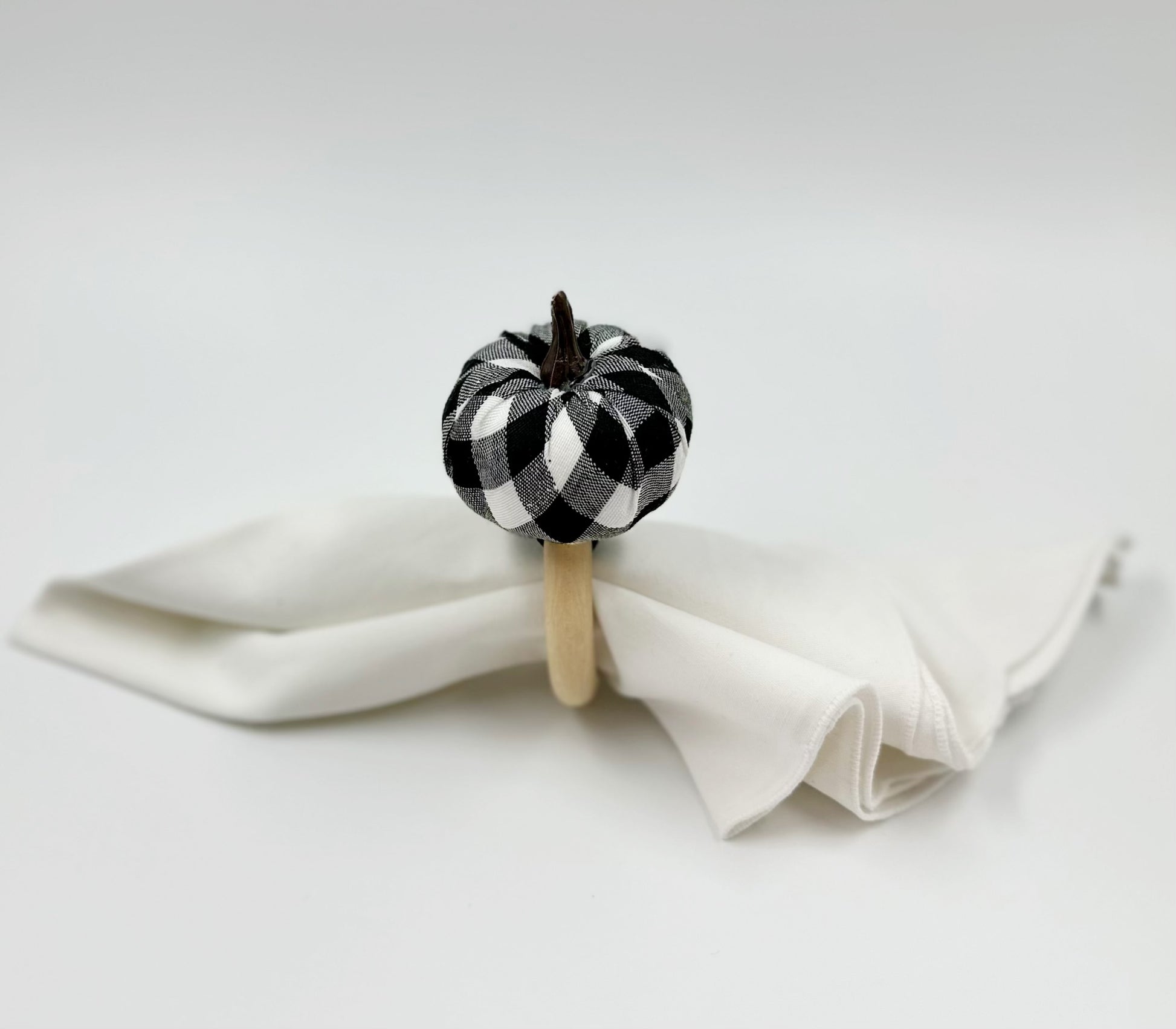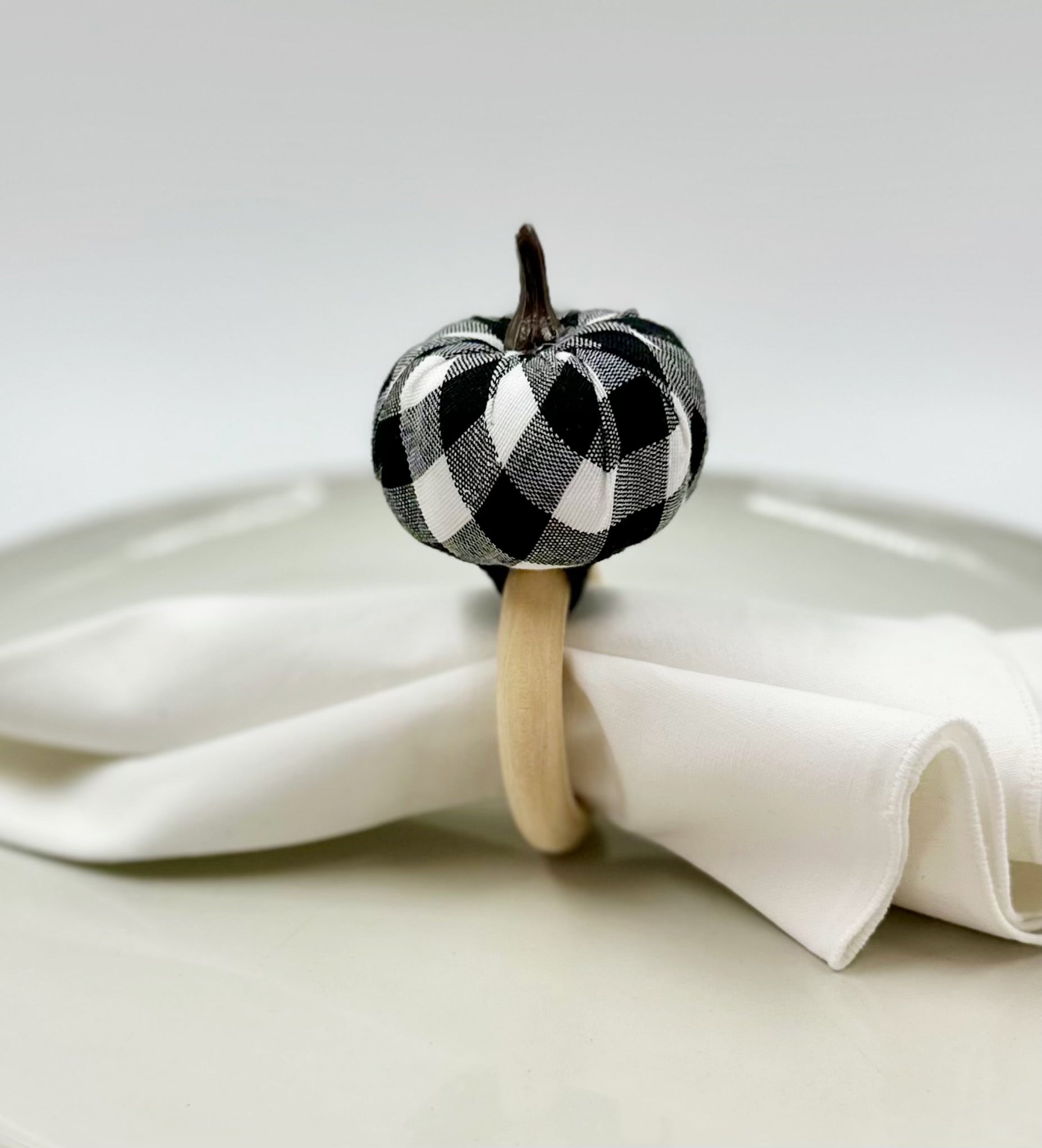 Add a touch of modern elegance and warmth to your table with our charming plaid pumpkin napkin rings. Featuring black and white checkered pumpkins, each measuring 2.5 inches, and set on natural wooden rings approximately 2 inches in diameter, these napkin rings are the perfect accent for any occasion, especially Thanksgiving.