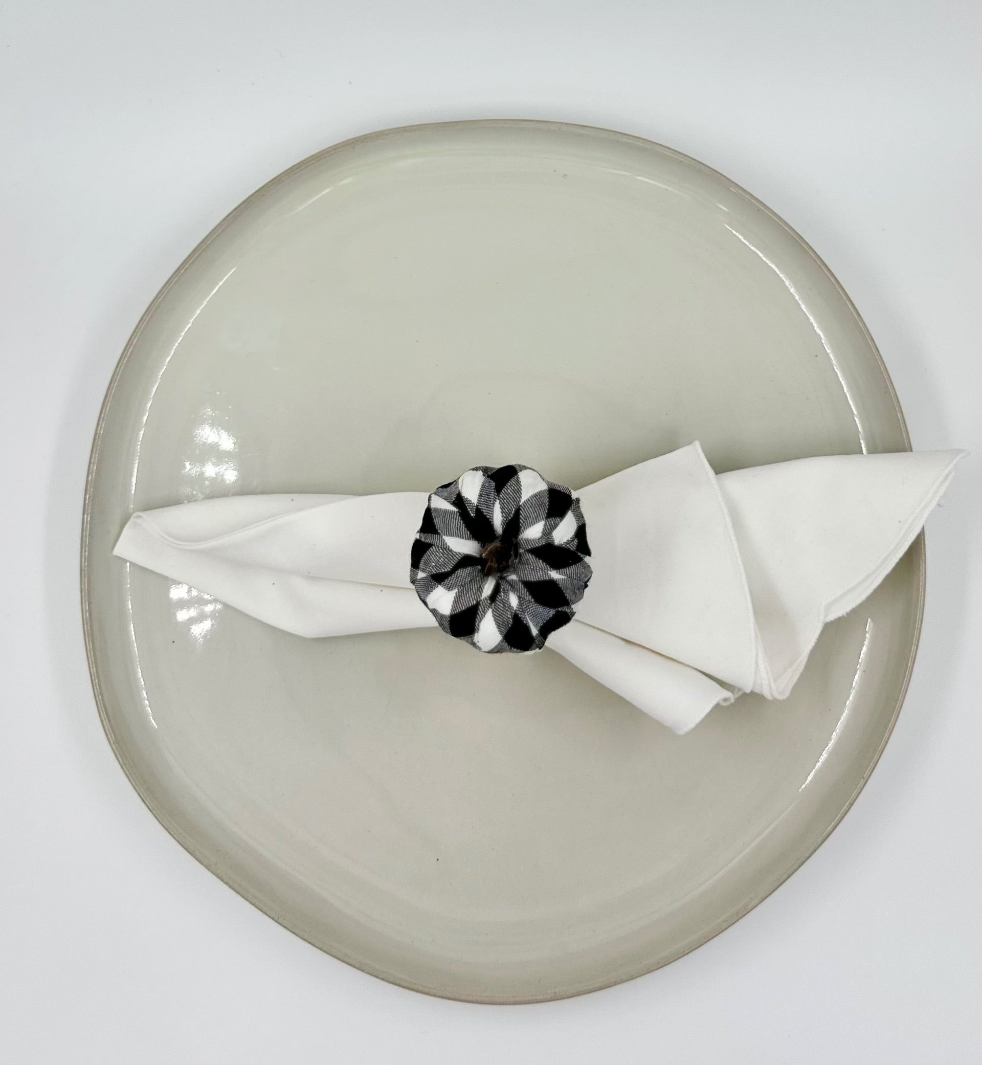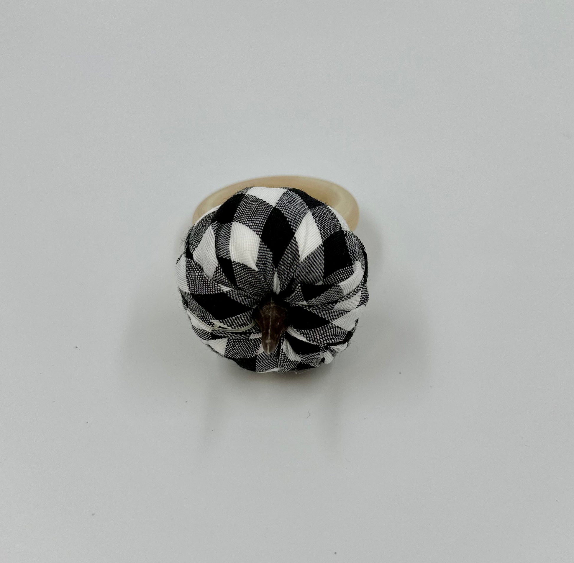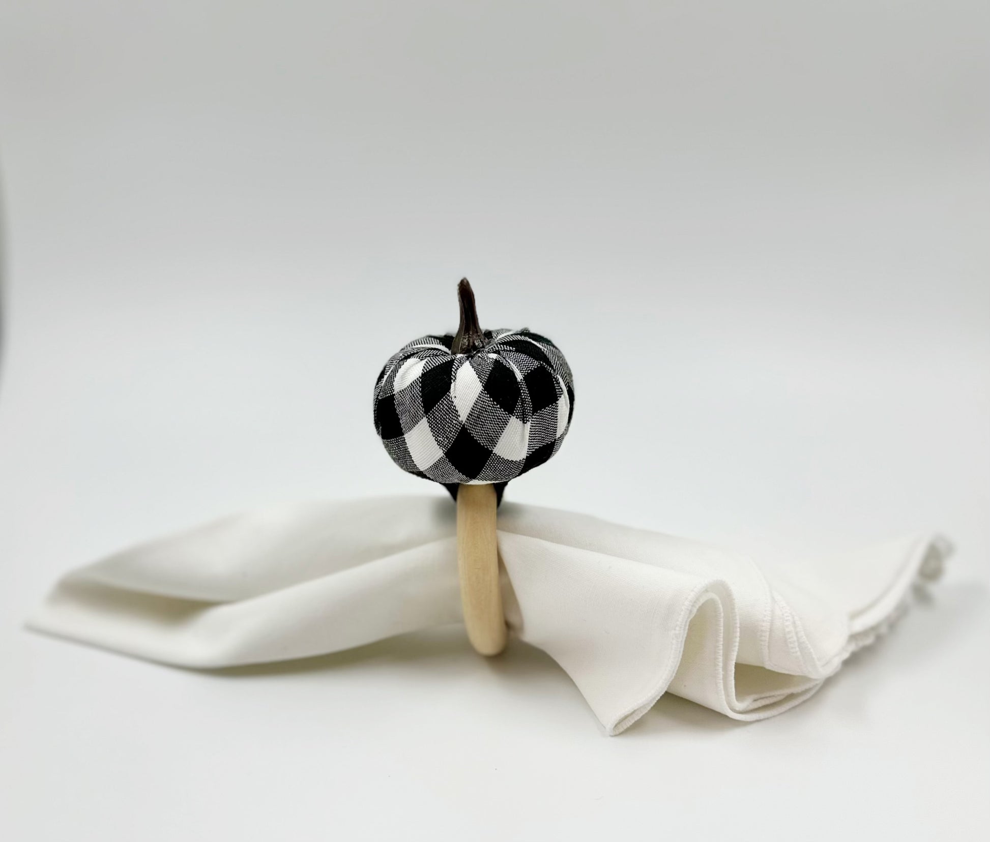 Add a touch of modern elegance and warmth to your table with our charming plaid pumpkin napkin rings. Featuring black and white checkered pumpkins, each measuring 2.5 inches, and set on natural wooden rings approximately 2 inches in diameter, these napkin rings are the perfect accent for any occasion, especially Thanksgiving.