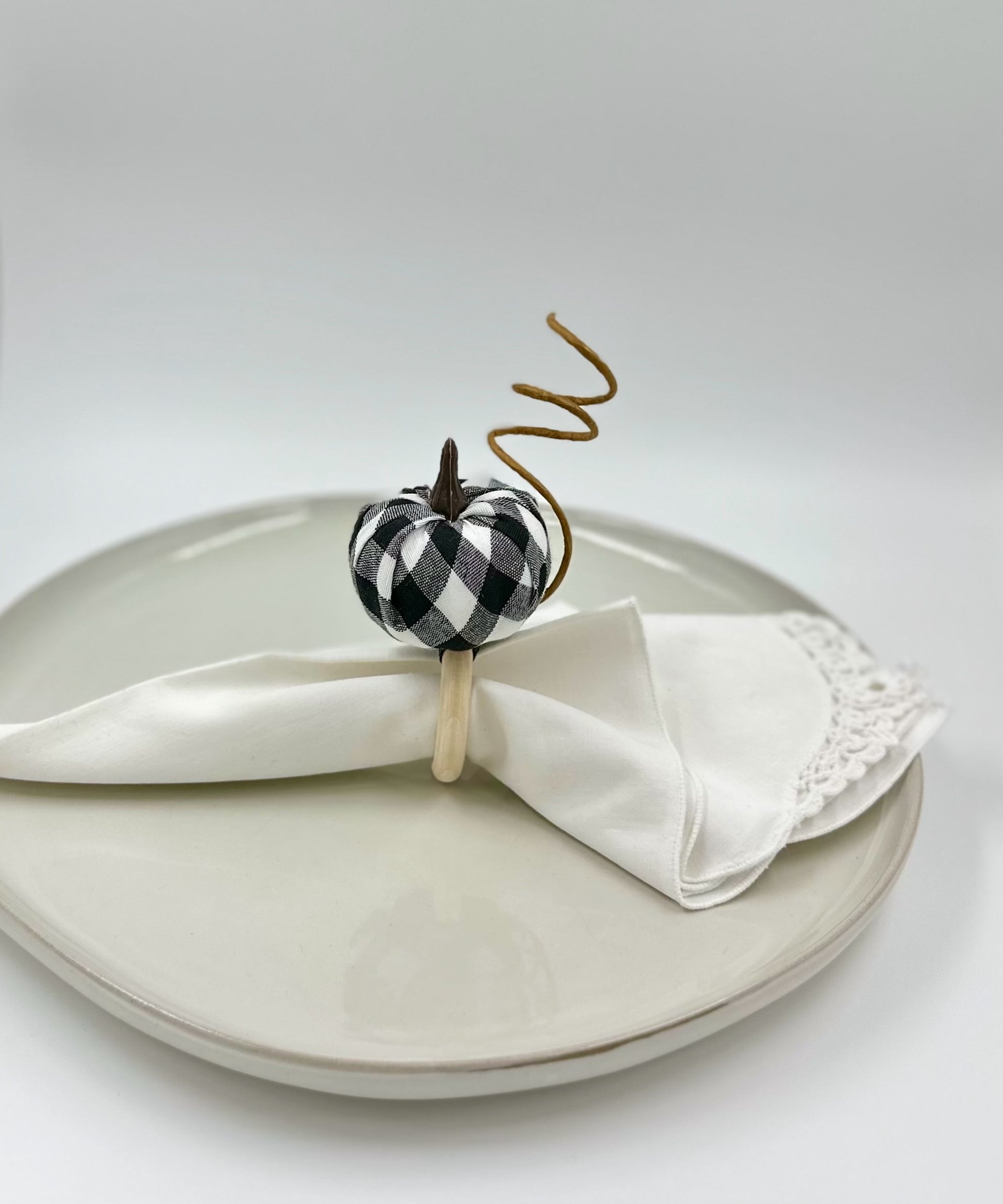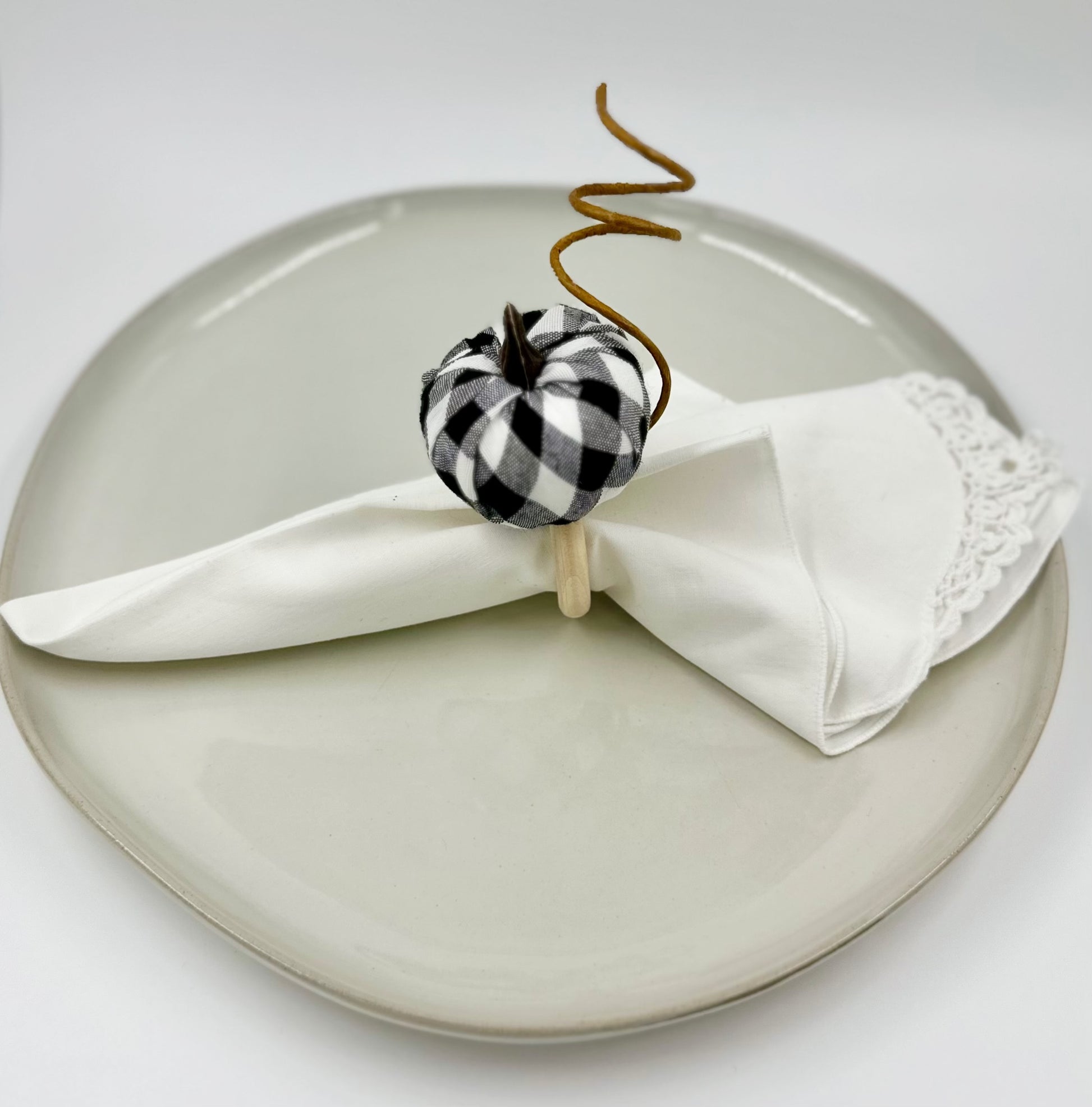 Add a touch of modern elegance and warmth to your table with our charming plaid pumpkin napkin rings. Featuring black and white checkered pumpkins, each measuring 2.5 inches, and set on natural wooden rings approximately 2 inches in diameter, these napkin rings are the perfect accent for any occasion, especially Thanksgiving.