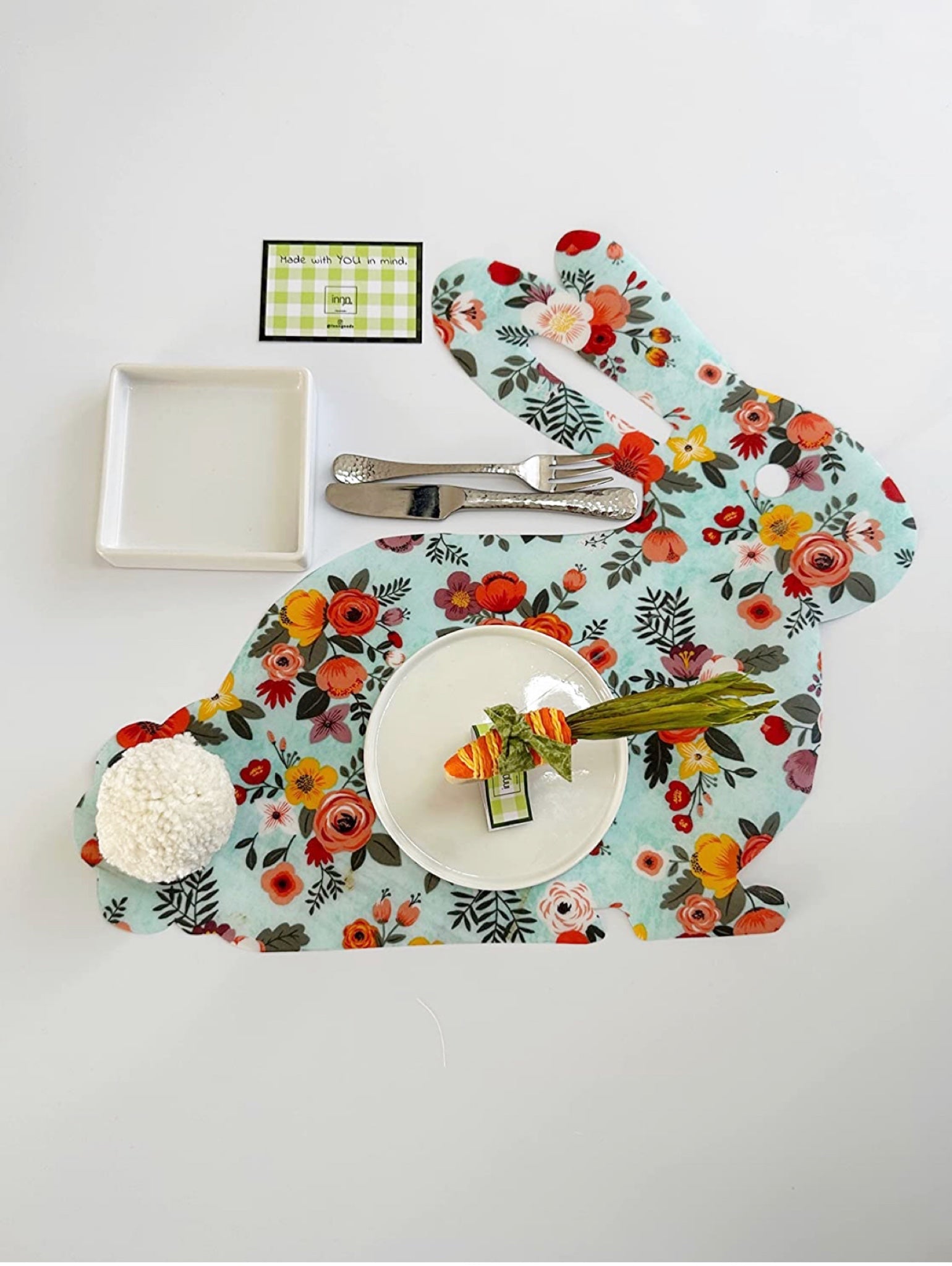 Hop into spring with our adorable Easter bunny placemat! Featuring a cute white pompom tail and a flower print that adds a pop of color to your table, this placemat is perfect for your Easter celebration or any spring gathering. And the best part? It's super easy to clean so you can spend more time enjoying the festivities!