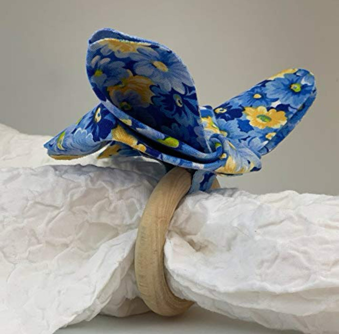 Bring a touch of artistry and nature to your dining table with our handmade set of 4 napkin rings, featuring exquisite fabric butterflies crafted using Japanese origami techniques. Each butterfly, approximately 4 inches in size, showcases a delightful print of blue and yellow flowers, adding a cheerful and fresh ambiance to your table setting. Paired with natural wood rings, about 2 inches in diameter, these napkin rings are versatile and complement any napkin design. Perfect for family dinners, garden parties, or special occasions, these unique napkin rings are a charming addition to your table decor.