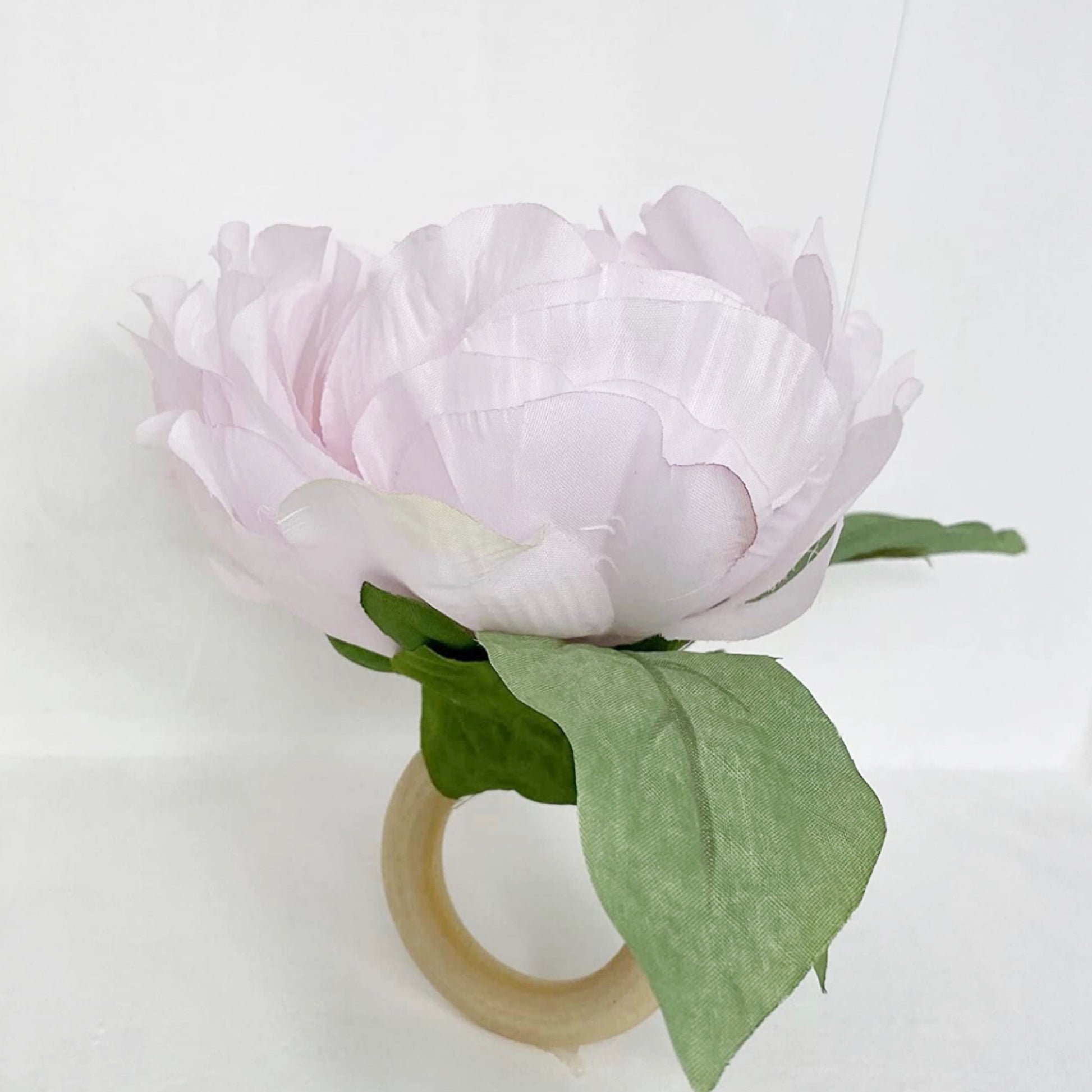 Add a touch of spring to your table with these beautiful handmade napkin rings featuring delicate soft pink peonies and two green leaves. Perfect for enjoying meals with loved ones, these rustic napkin rings come in a set of four and will add an elegant touch to your spring table decor. Each ring has an approximate inner diameter of 2 inches and the flower measures approximately 4.5 inches by 4.5 inches. Handcrafted in the US, these flower napkin rings are sure to bring joy to any occasion. Contact us if you need more quantity.