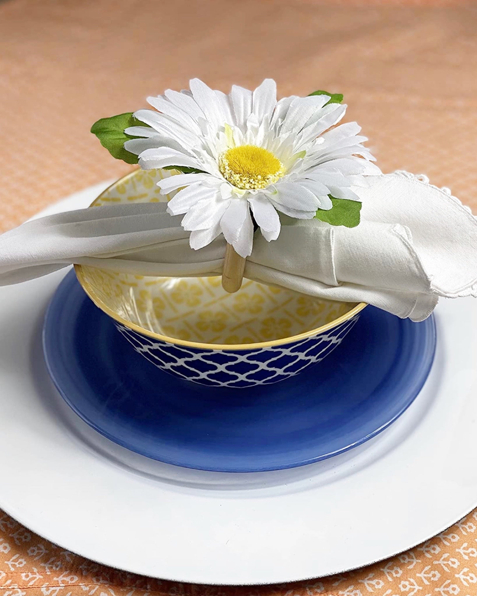 Add a touch of nature to your table with these beautiful flower napkin rings! Made with natural wood rings and featuring a delicate white gerbera daisy with green leaves, these napkin rings are perfect for any occasion. Whether you're hosting a dinner party, brunch, or wedding, these rustic napkin rings will add charm to your table setting. Each set includes four flower napkin rings, and they're handcrafted in the US. Simply slide your favorite napkins through the ring and enjoy a beautiful meal with friends and family!