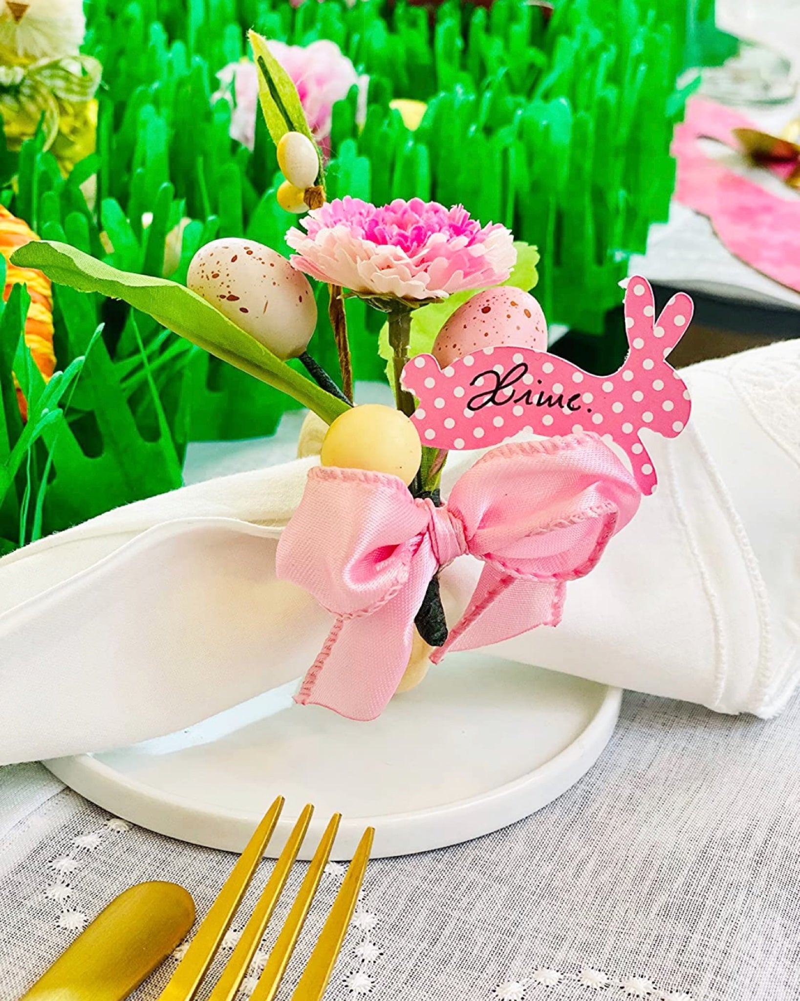 Add a touch of sweetness to your Easter table with these adorable pink egg napkin rings! Each set comes with 4 handmade rustic rings made from natural wood, with a delicate bouquet featuring a cute pink flower, green leaf,2 eggs different size and a pretty pink ribbon bow. Perfect for any occasion, these napkin rings will add a playful and charming touch to your dinner party, brunch, or Easter gathering. And let's not forget about the bunnies - they'll love it too!