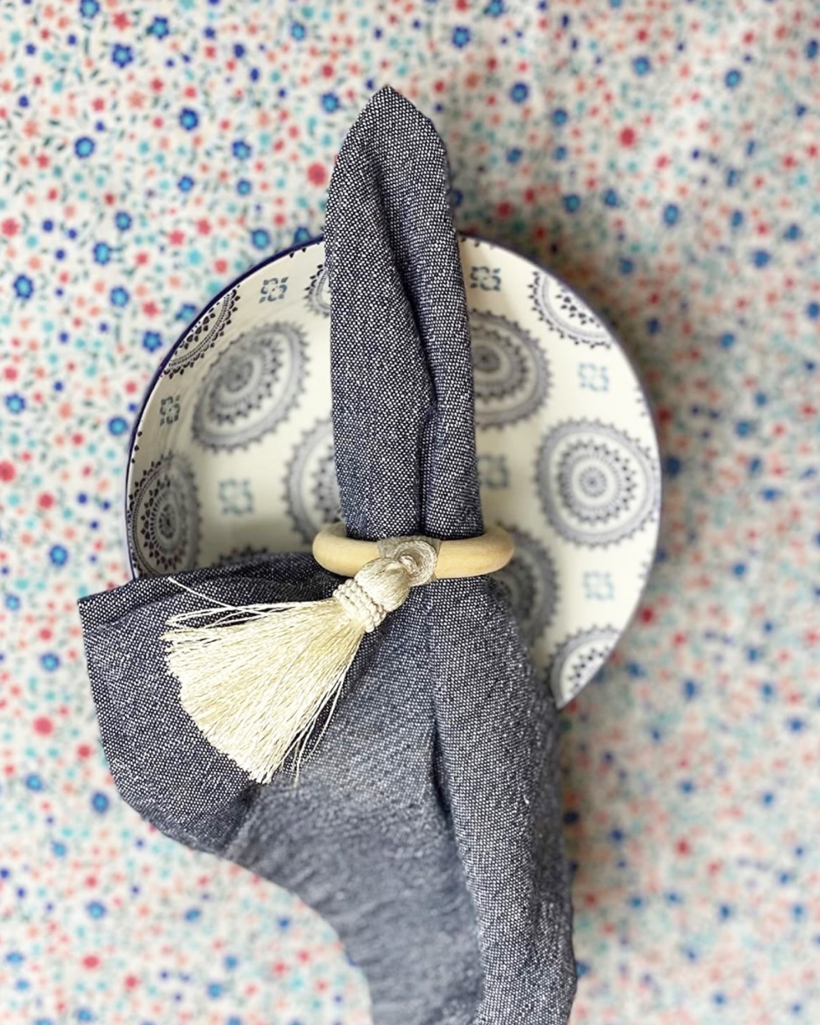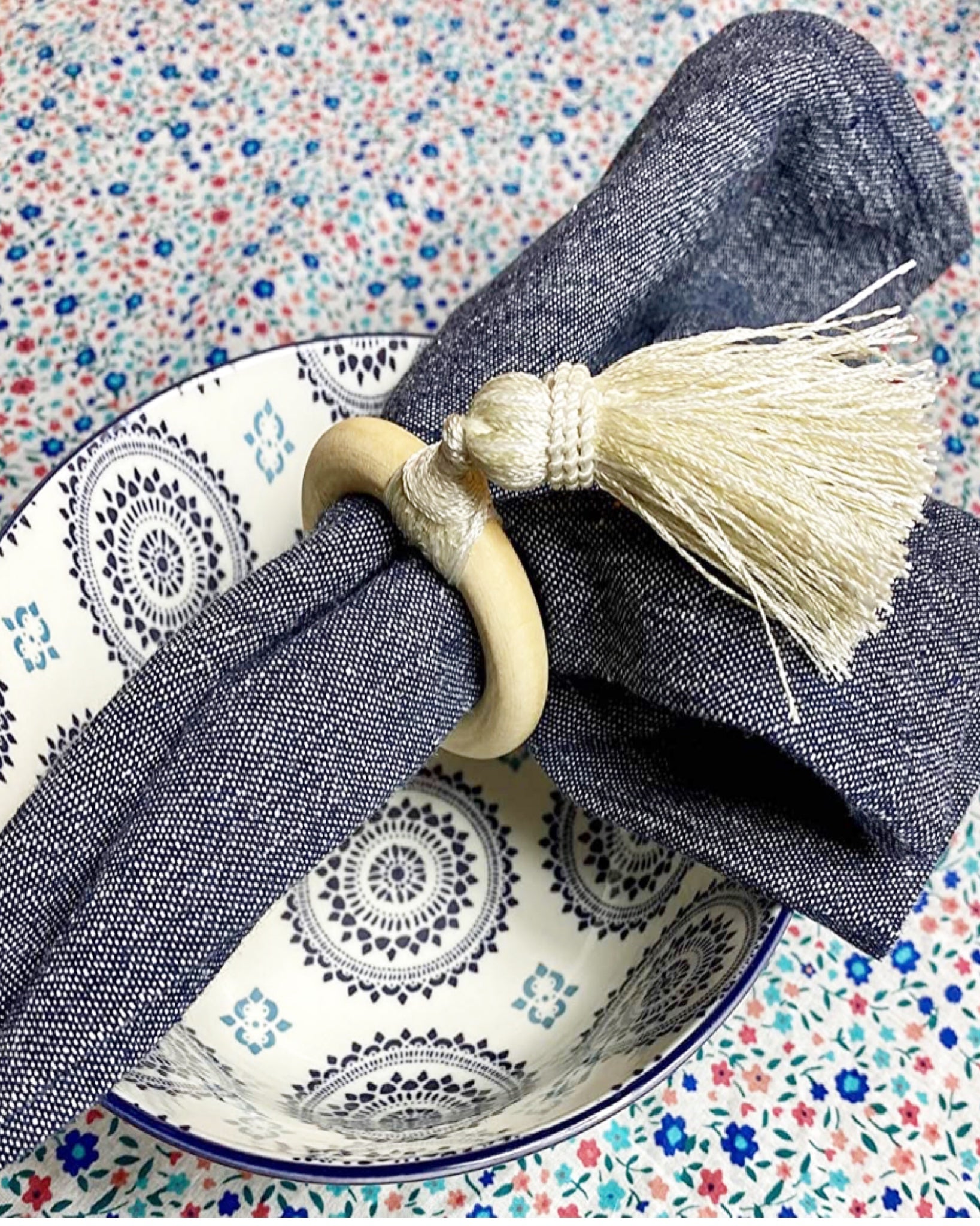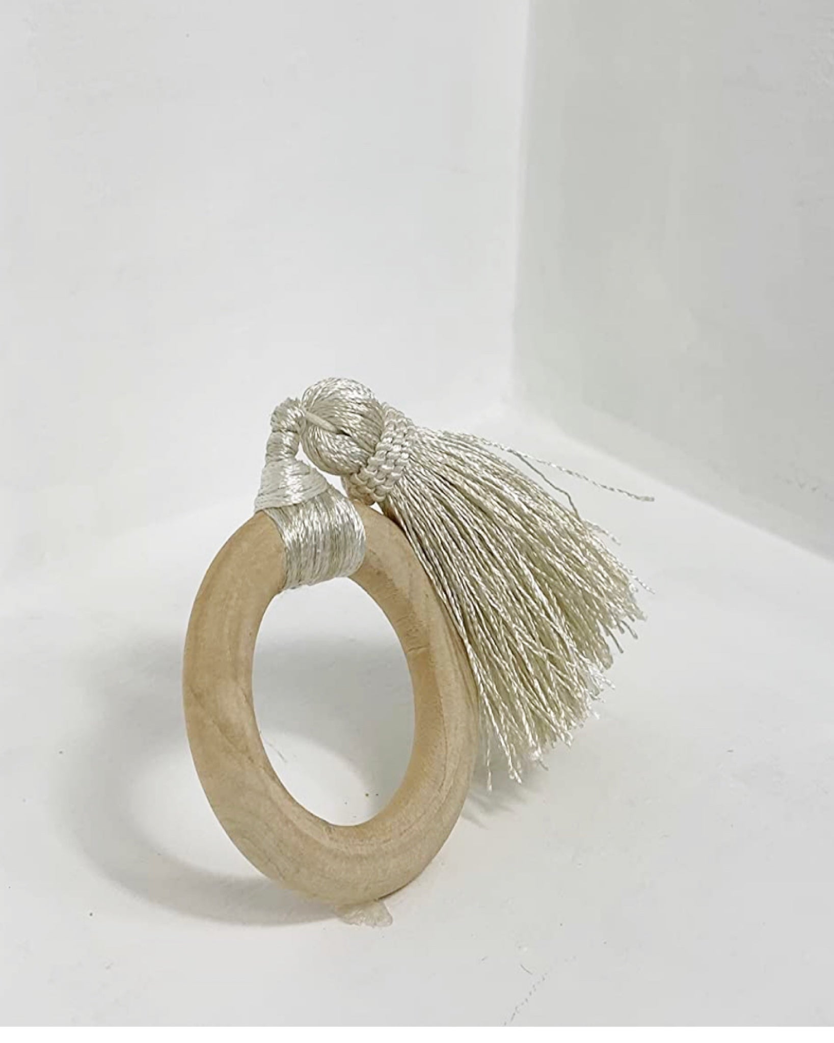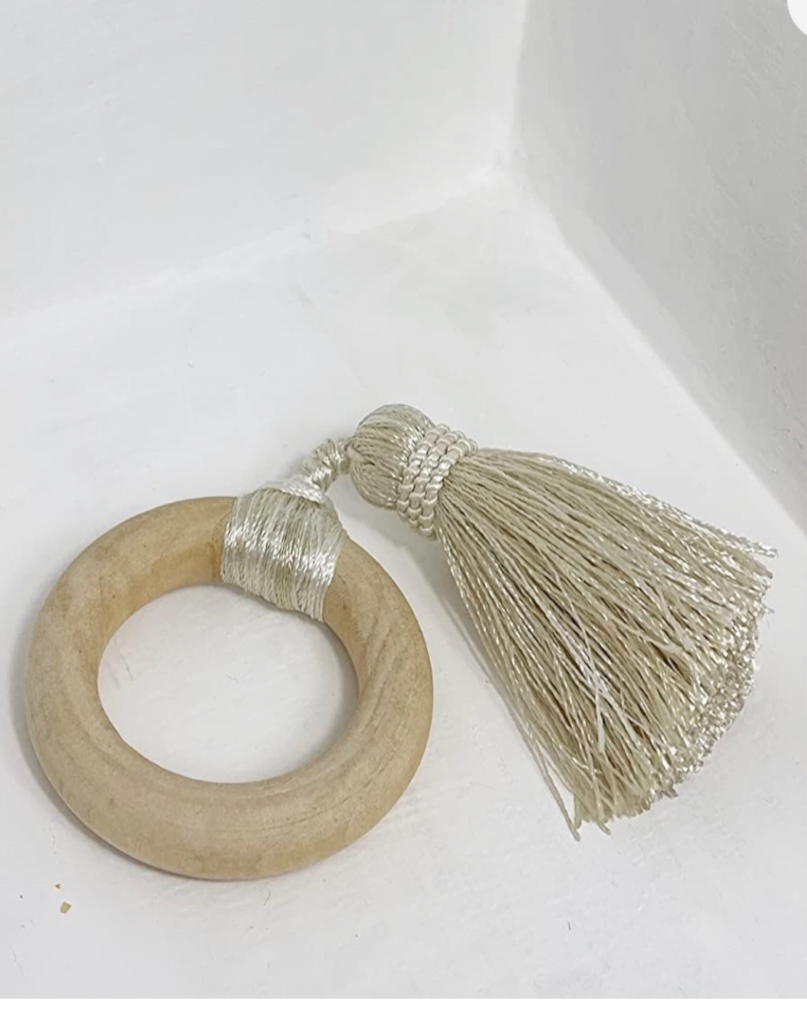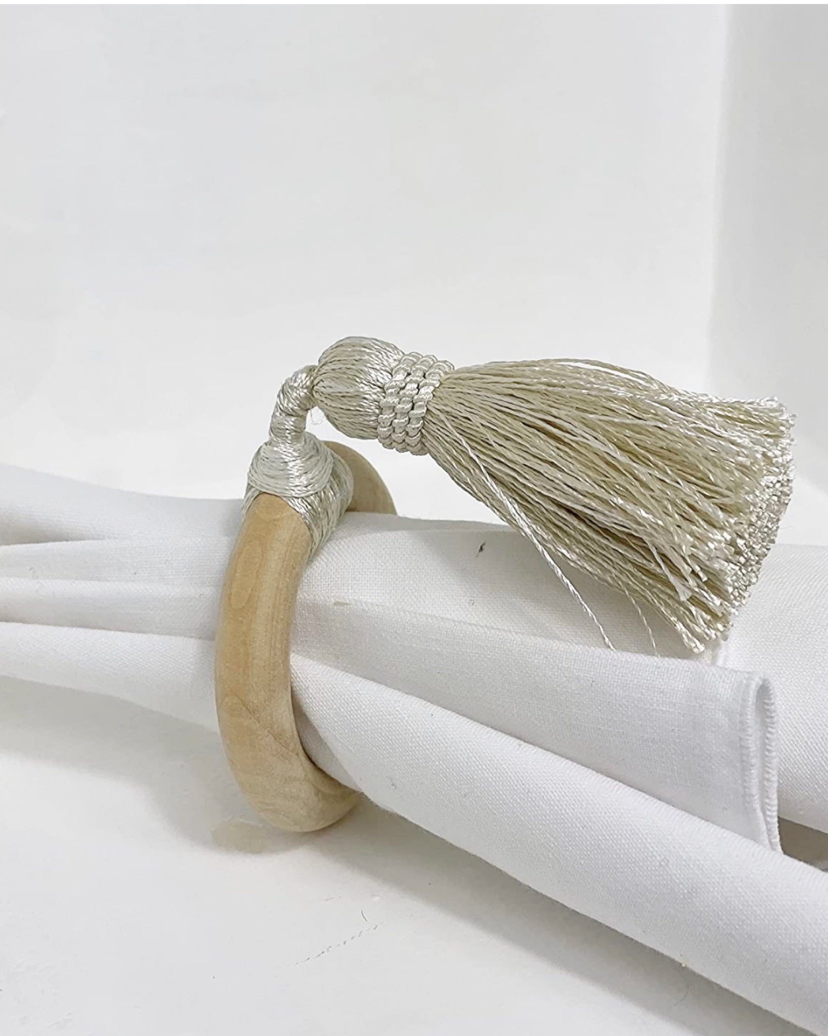 Add a touch of elegance to your table setting with these handmade cream silk-like thread tassel napkin rings! Made with natural wood rings, each set of four napkin rings features a delicate silk-like tassel that can be paired with any style of table decor, from rustic to vintage. Perfect for any occasion, these napkin rings will elevate your dinnerware and give your guests something to talk about.