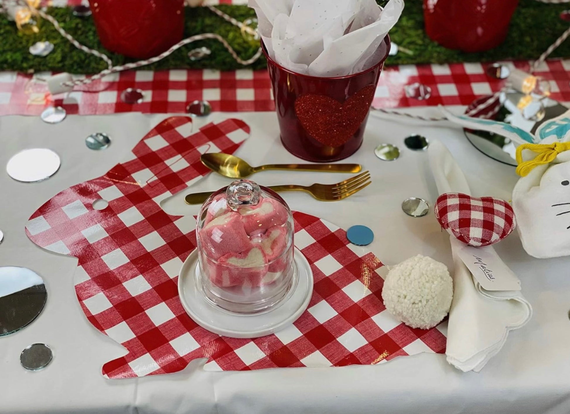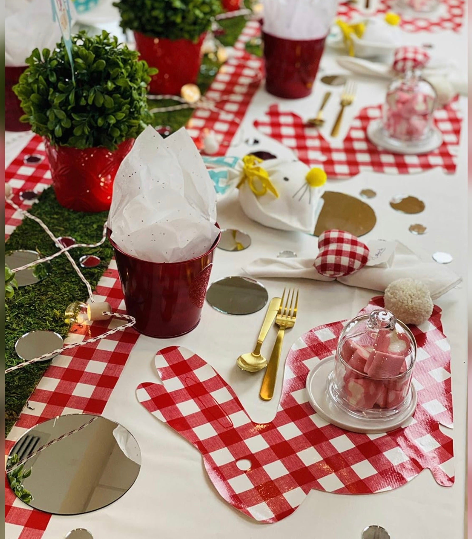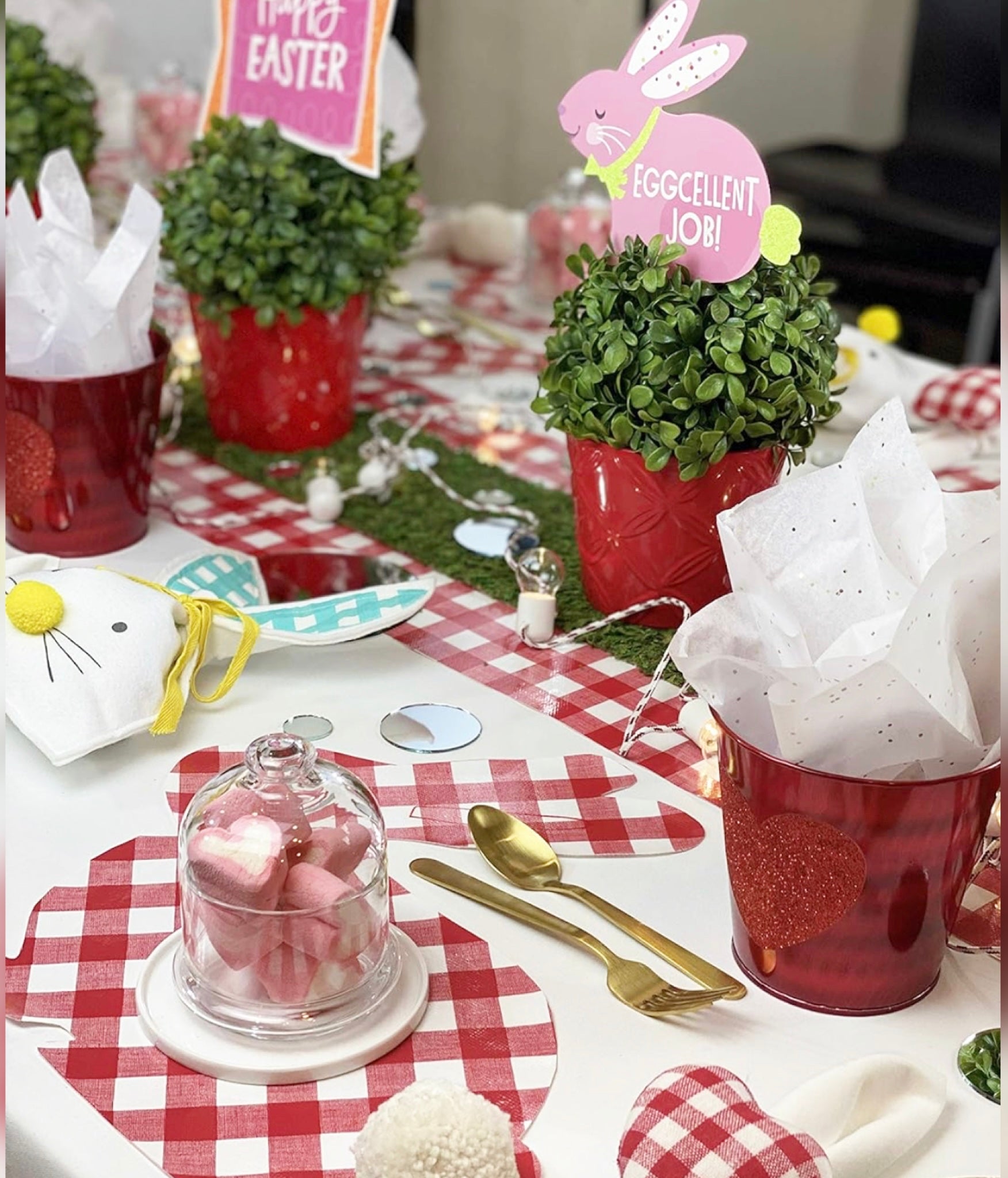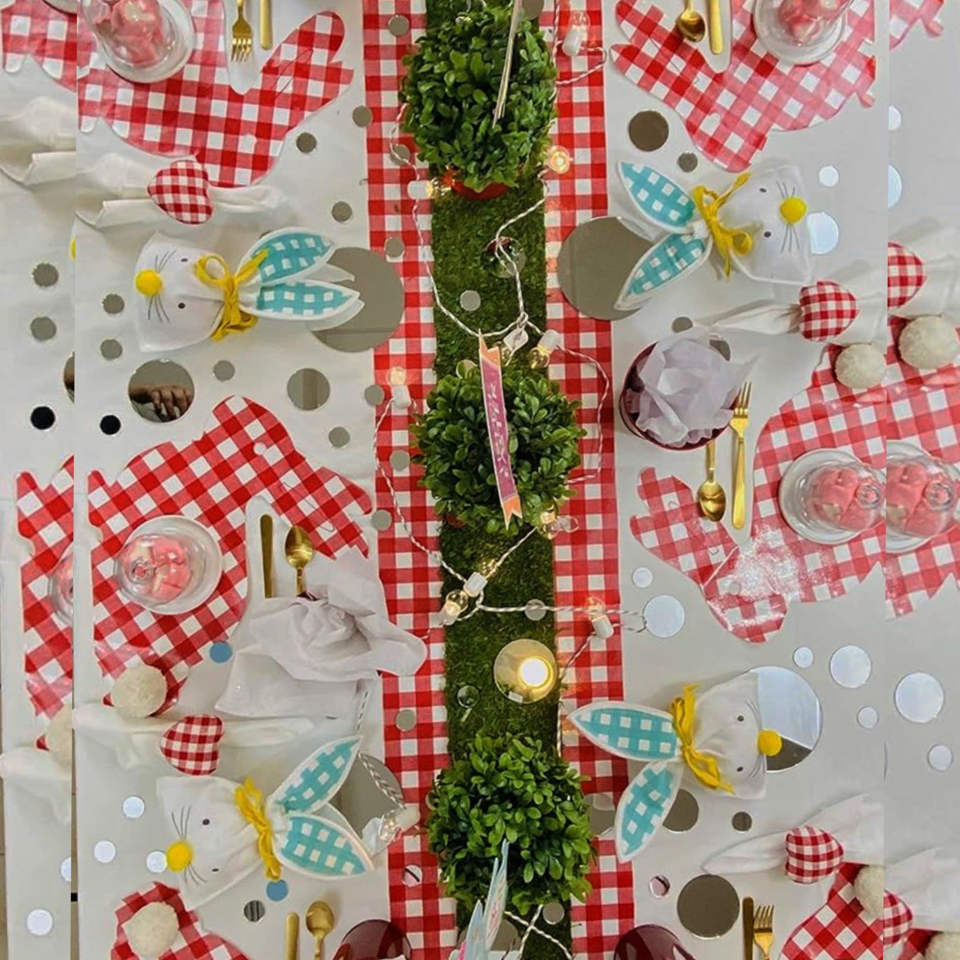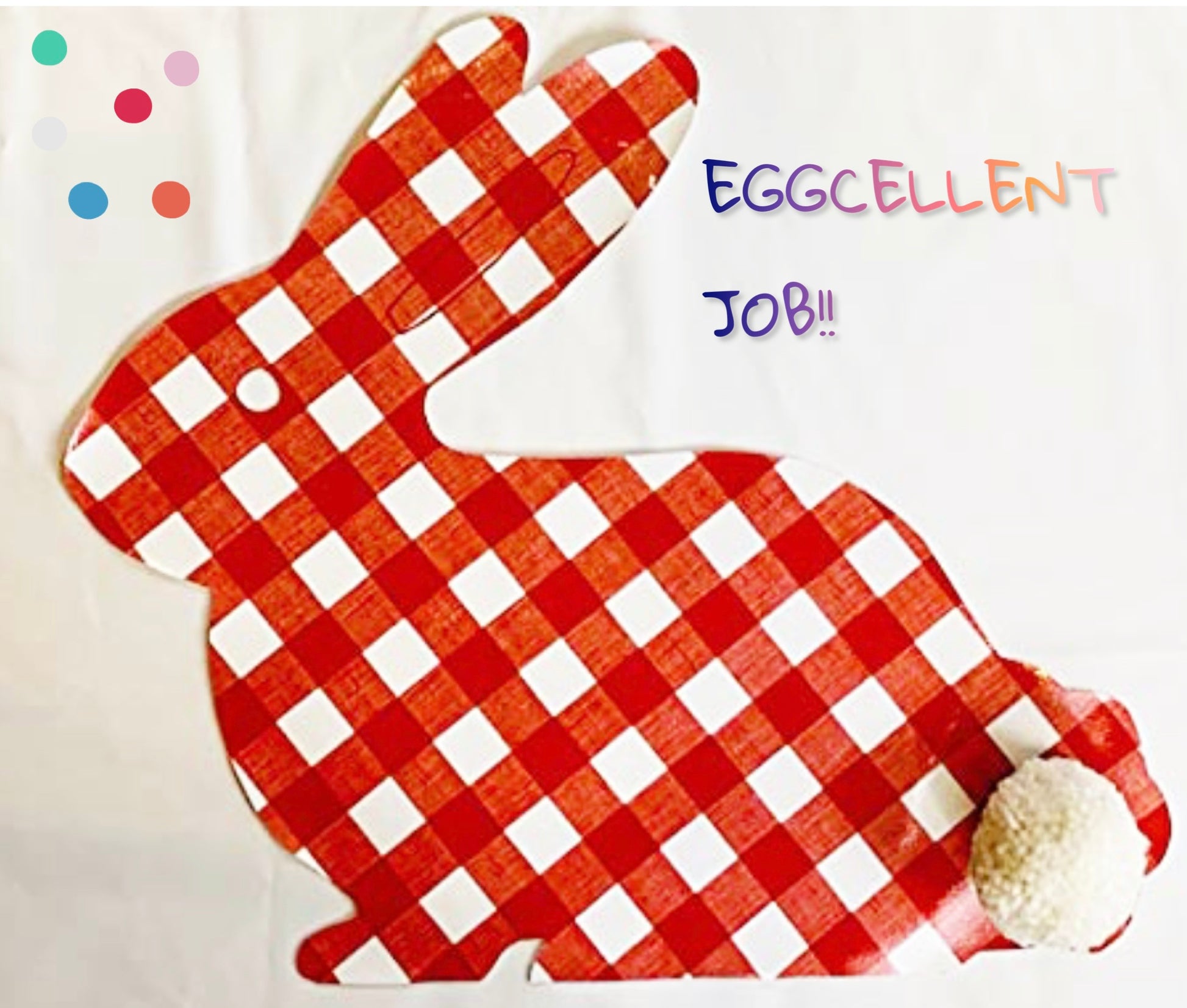 Elevate your table decor this Easter with our charming Easter Bunny shaped individual placemat. Crafted with love and attention to detail, this reusable placemat features a charming design with red and white squares, perfect for creating a festive atmosphere. The bunny's fluffy white cotton pom pom tail adds an adorable touch that will make your table truly special.